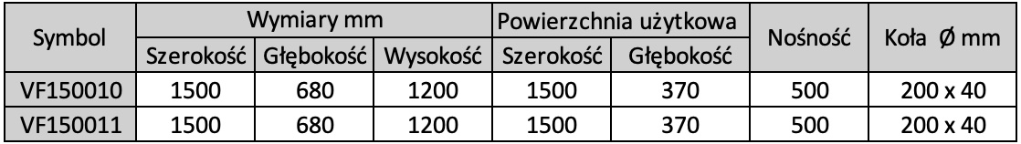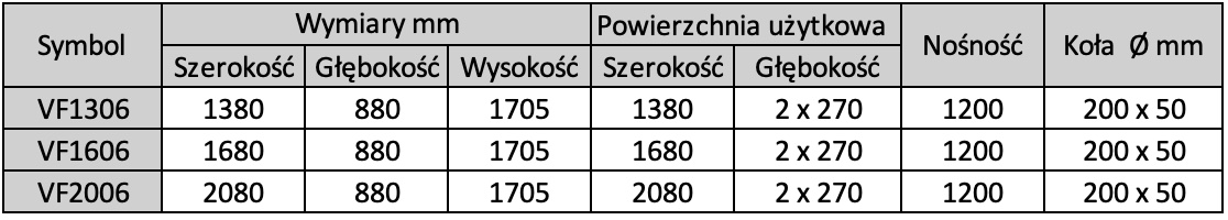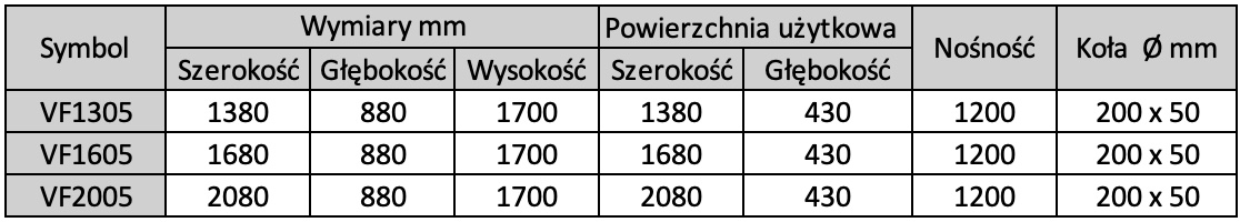 - koła Ø200 mm; koła z łożyskiem kulkowym, 2 koła obrotowe z hamulcem, 2 koła stałe