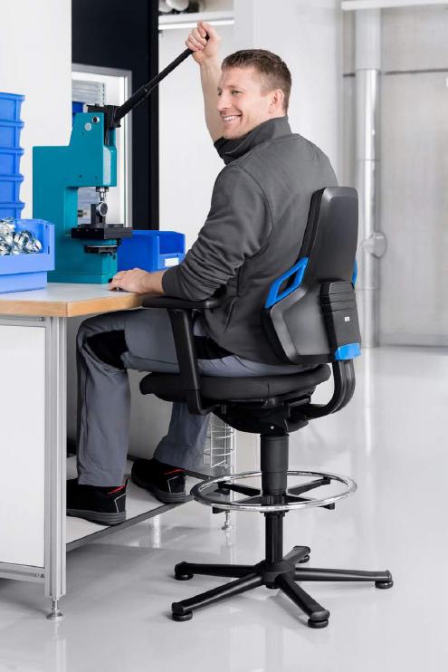 Krzesło przemysłowe BIMOS Nexxit cechuje bezkompromisowa niezawodność, wysoka jakość użytych materiałów, solidność konstrukcji, duża odporność na typowe czynniki występujące w procesach produkcyjnych: oleje, smary, tłuszcz, wióry, iskry, kurz. Posiada pełną i łatwą w ustawieniu regulację siedziska co sprawia, że dobrze sprawdza się w każdych warunkach pracy, daje pracownikowi swobodę ruchu i pełną ergonomię. Krzesło odpowiada wszystkim wytycznym z zakresu Bezpieczeństwa i higieny pracy - praca siedząca.
