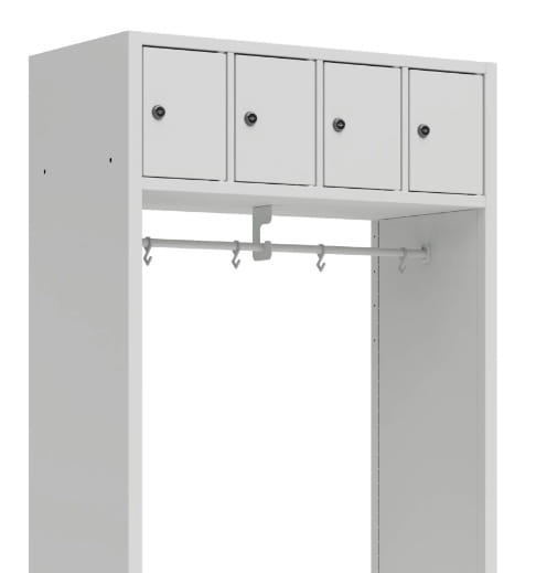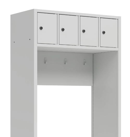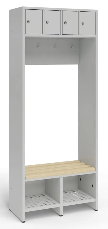 Zestaw do szatni, konstrukcja w całości została wykonana ze zgrzewanej blachy, posiada 4 zamykane skrytki i półki na buty. Do wyboru wariant z drążkiem z haczykami na ubrania lub panel z haczykami na ubrania.
