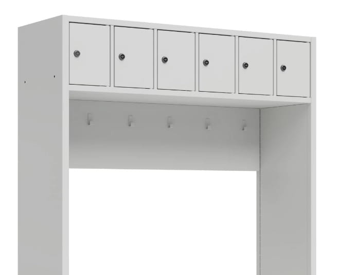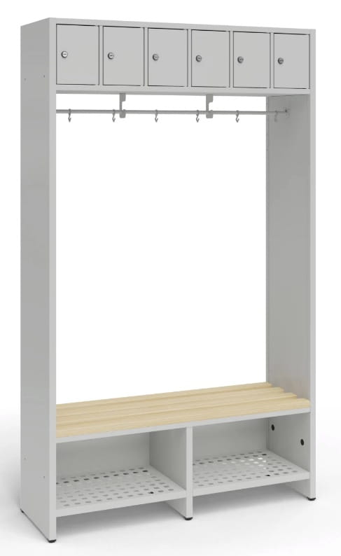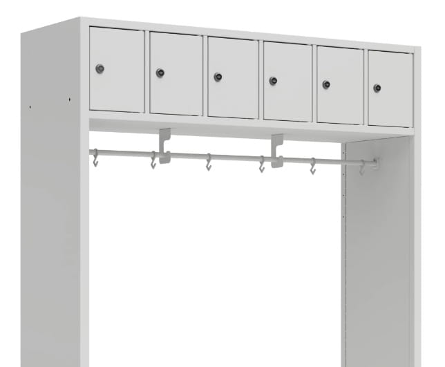 Zestaw do szatni, konstrukcja w całości została wykonana ze zgrzewanej blachy, posiada 6 zamykanych skrytek i półkę na buty. Do wyboru wariant z drążkiem z haczykami na ubrania lub panel z haczykami na ubrania.
