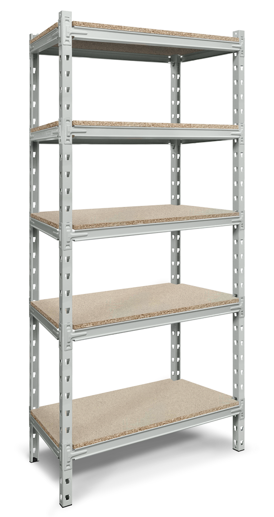 Regał magazynowy to podstawowe wyposażenie magazynu, warsztatu lub hali. Regał magazynowy pozwala na bezpieczne składnie produktów i towarów. Regał metalowy wyposażony jest w pięć półek z płyty wiórowej. Stopki regału zabezpieczają posadzkę przed uszkodzeniem.