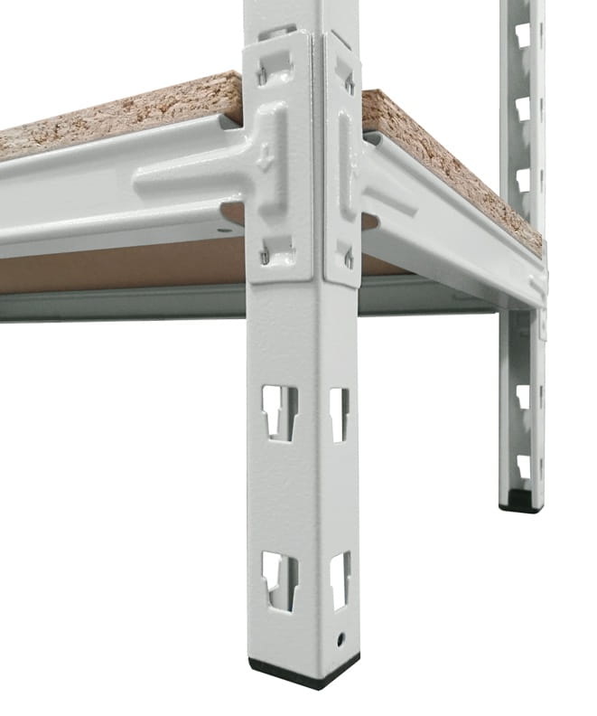 - nogi regału zostały wykonane z giętej blachy stalowej - kątownika o grubości 1,0 mm z perforacją umożliwiającą regulację mocowania półek co 67 mm,