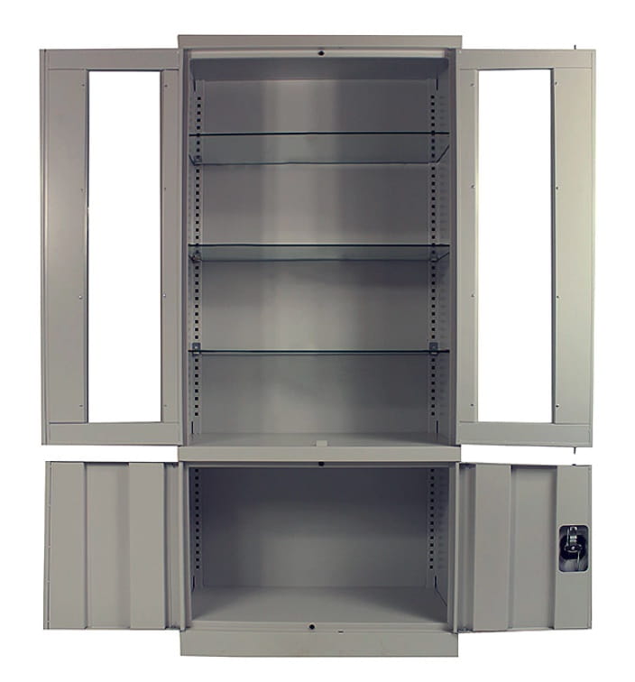 Szafa lekarska metalowa z przeszkleniem i schowkiem.