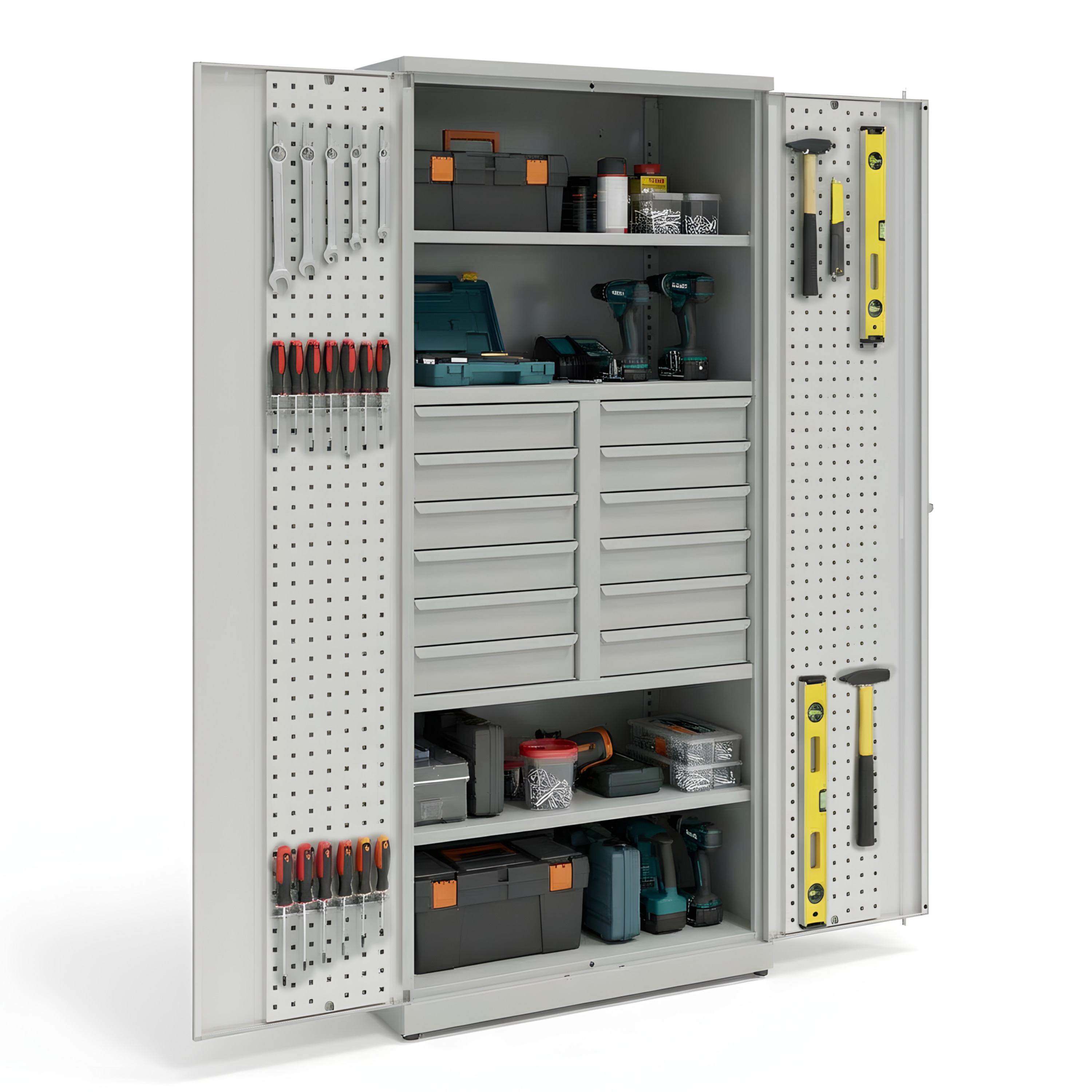 Szafa narzędziowa, 2 półki, 12 szuflad, panele perforowane na drzwiach, kod: TMSN15