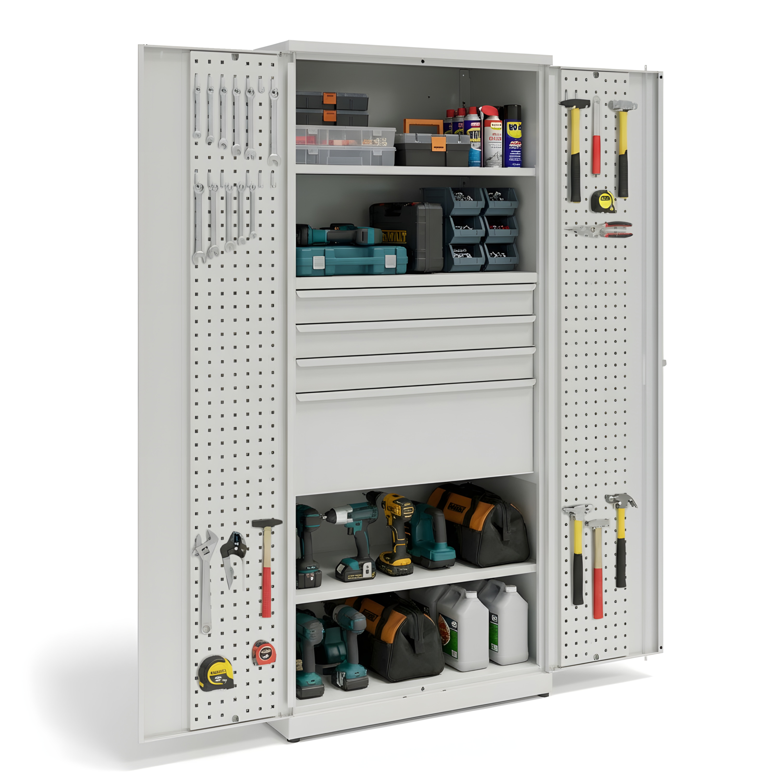 Szafa narzędziowa do przechowywania, została wyposażona w 2 półki przestawne, 3 szuflady wys. 100mm, 1 szuflada wys. 300mm, 1 szuflada wys. 300mm oraz panel perforowany na drzwiach.