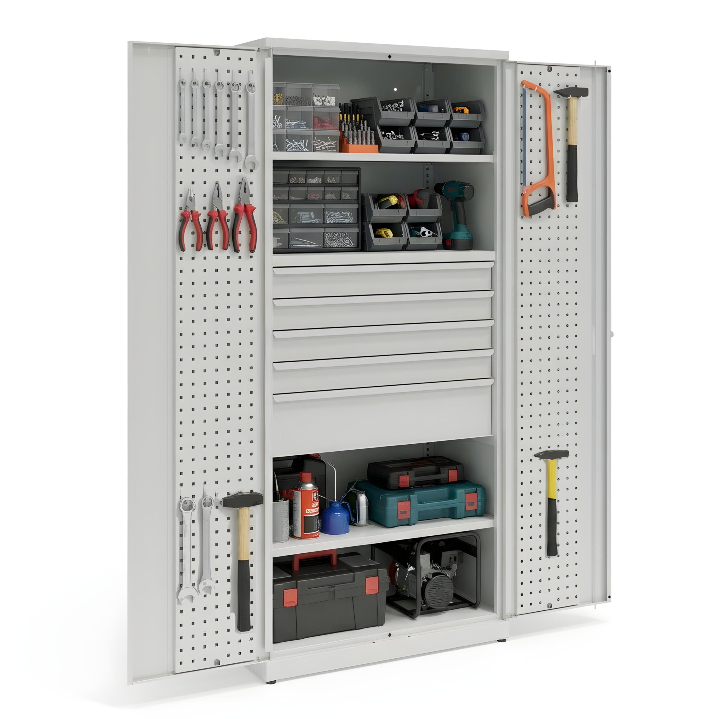 Szafa narzędziowa, 2 półki, 5 szuflad, panele perforowane na drzwiach, kod: TMSN01