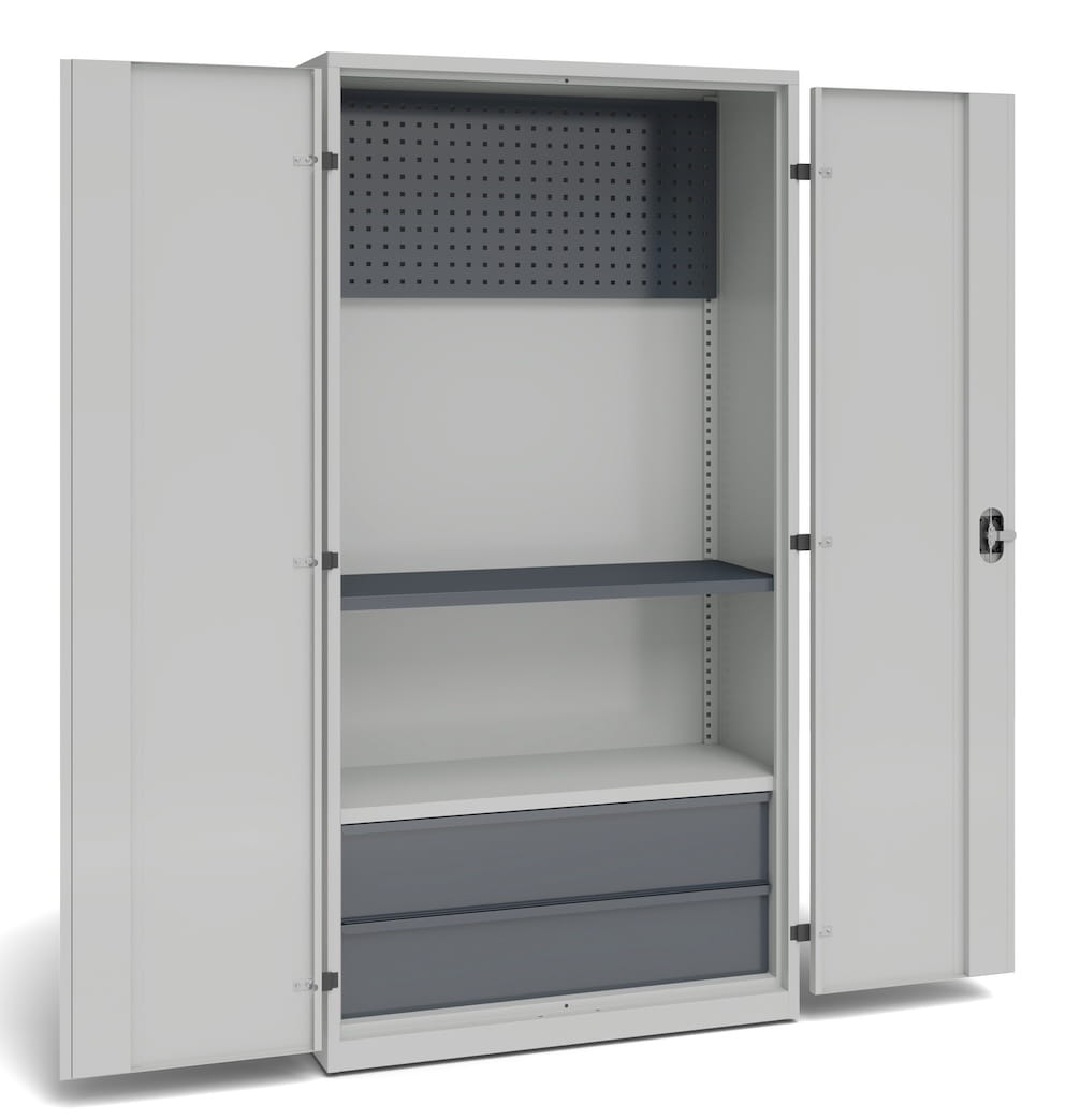 Szafa narzędziowa do przechowywania, została wyposażona w panel perforowany, 1 przestawną półkę, 1 półkę stałą, 2 szuflady o wysokości 100 mm