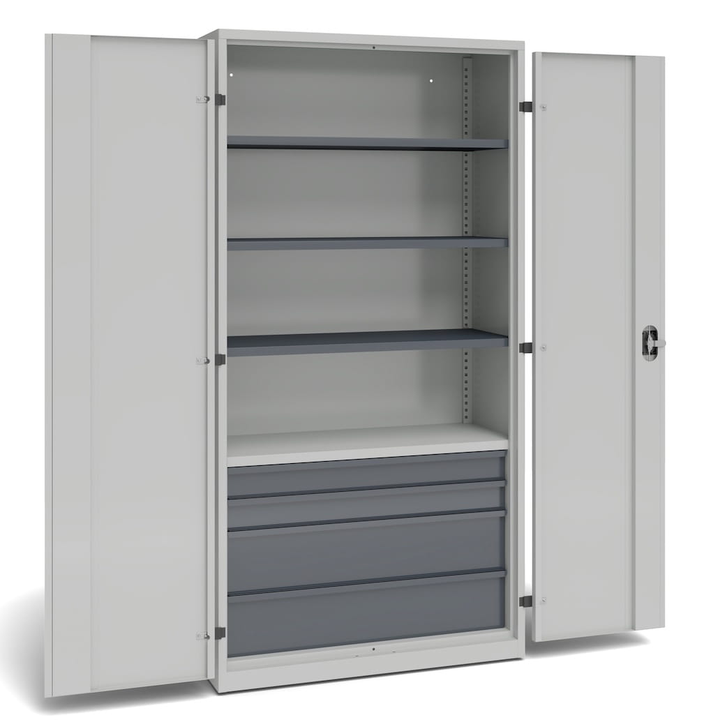 - drzwi szafy warsztatowej osadzone na zawiasach zewnętrznych, zamykane zamkiem z pokrętłem, z 3 punktowym systemem ryglowania