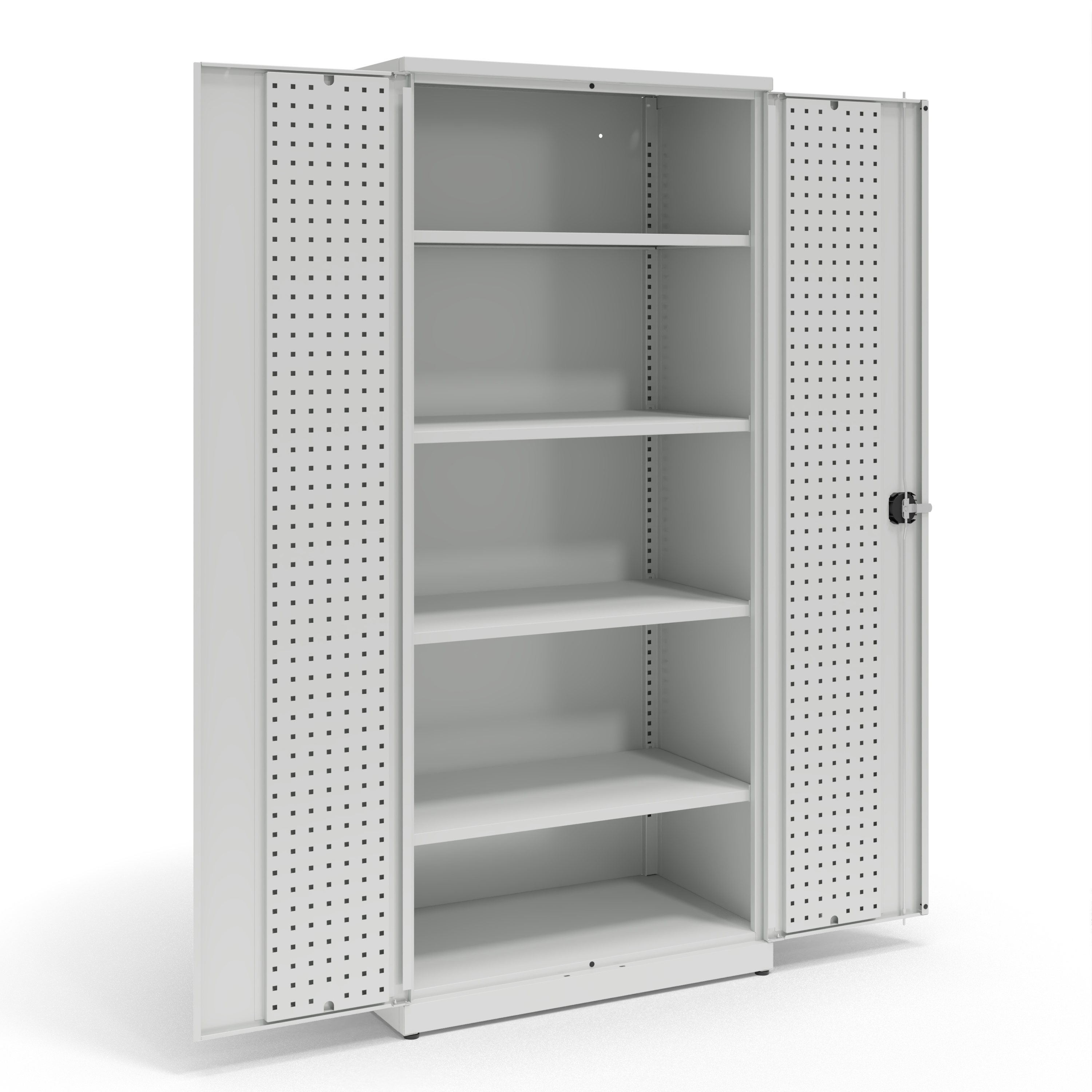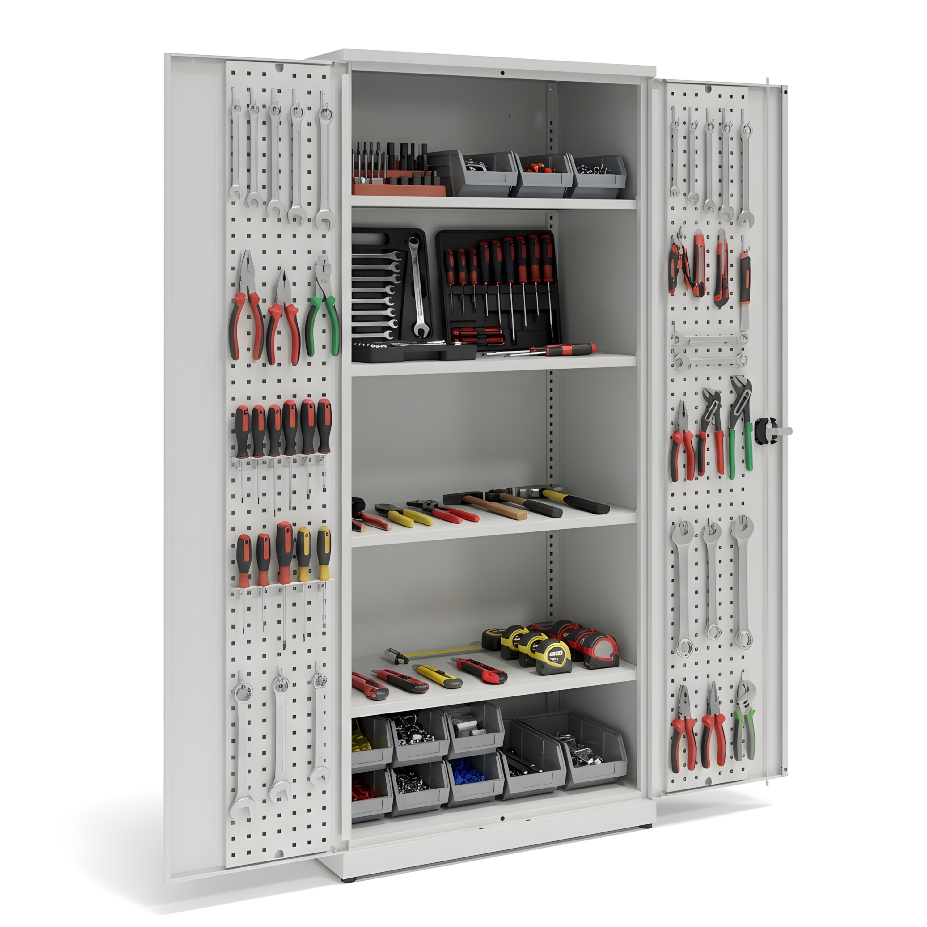 szafa warsztatowa o solidnej konstrukcji z pełnymi drzwiami, z panelami perforowanymi,