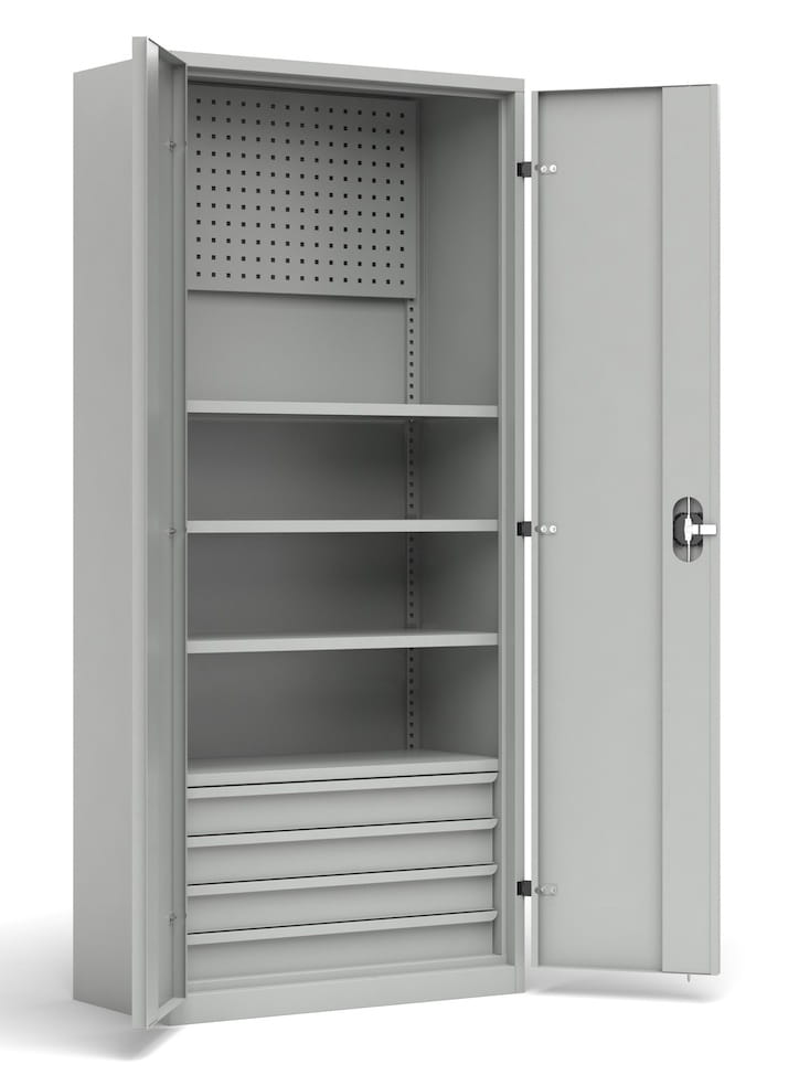 Szafa narzędziowa do przechowywania, została wyposażona w panel perforowany, 2 półki przestawne, 1 półkę stałą i 4 szufladami o wysokości 100 mm.