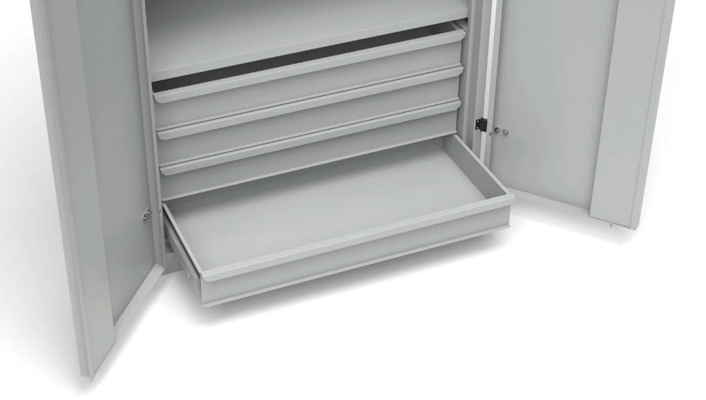 - drzwi szafy warsztatowej osadzone na zawiasach zewnętrznych, zamykane zamkiem z pokrętłem, z 3 punktowym systemem ryglowania