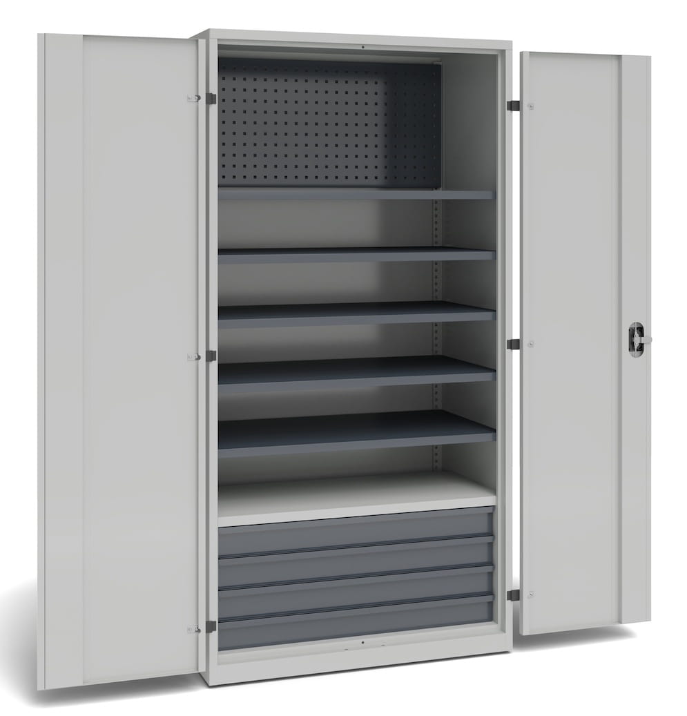Szafa warsztatowa do przechowywania z 5 przestawnymi półkami, 1 stałą półką, 4 szufladami o wysokości 100 mm.
