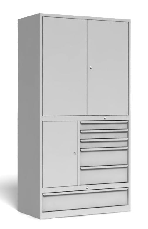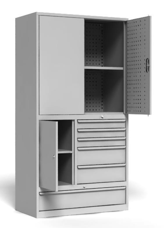 Szafa narzędziowa do przechowywania, składa się z trzech modułów: górnego z szafką z podwójnymi drzwiami skrzydłowymi, modułu środkowego z szafką i 5 szufladami i dolnego składającego się z dwóch szuflad.