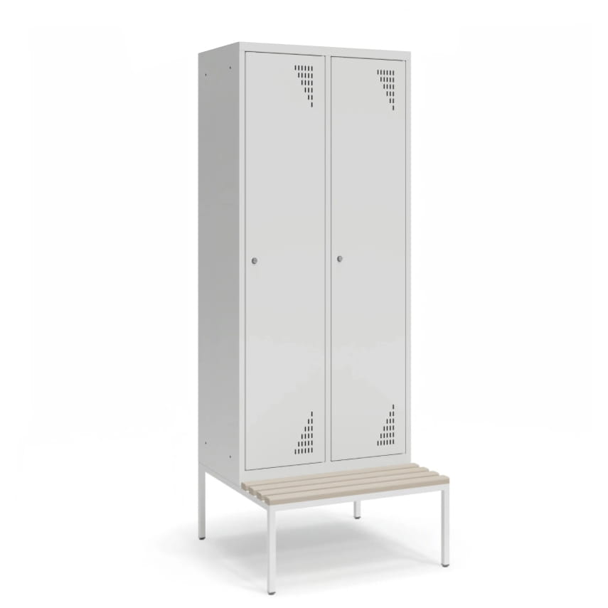 Szafa ubraniowa BHP z ławką do przechowywania. Szafa wykonana z konstrukcji zgrzewanej. Szafa metalowa posiada 2 kolumny z dwoma schowkami z przegrodą. Szafa ubraniowa idealnie sprawdzi się w szatni.