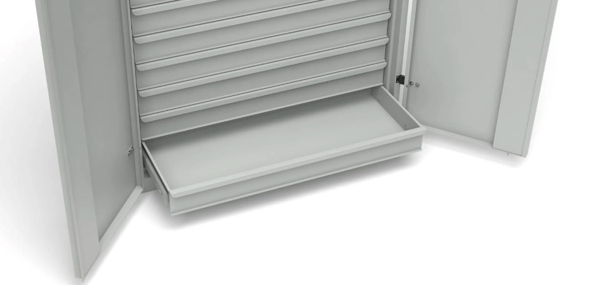 Szafa warsztatowa do przechowywania z 2 szufladami o wysokości 200 mm i 14 szufladami o wysokości 100 mm.