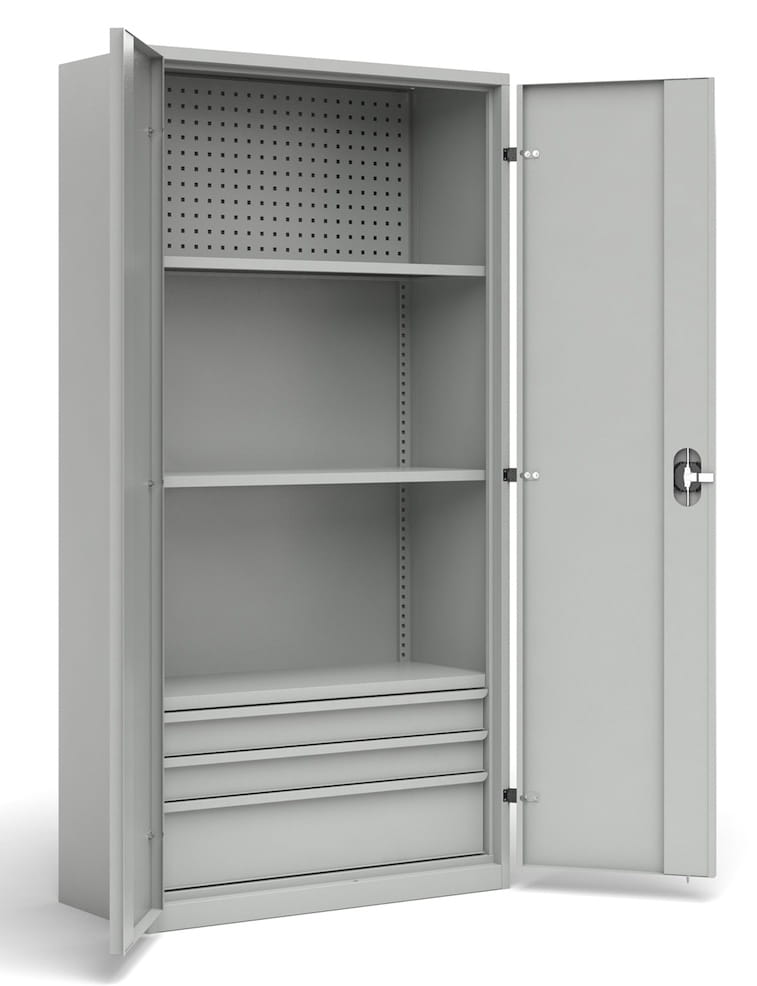 Szafa warsztatowa do przechowywania, została wyposażona w panel perforowany, 2 półki przestawne, 1 półkę stałą i 2 szufladami o wysokości 100 mm i 1 szufladę o wysokości 200 mm.