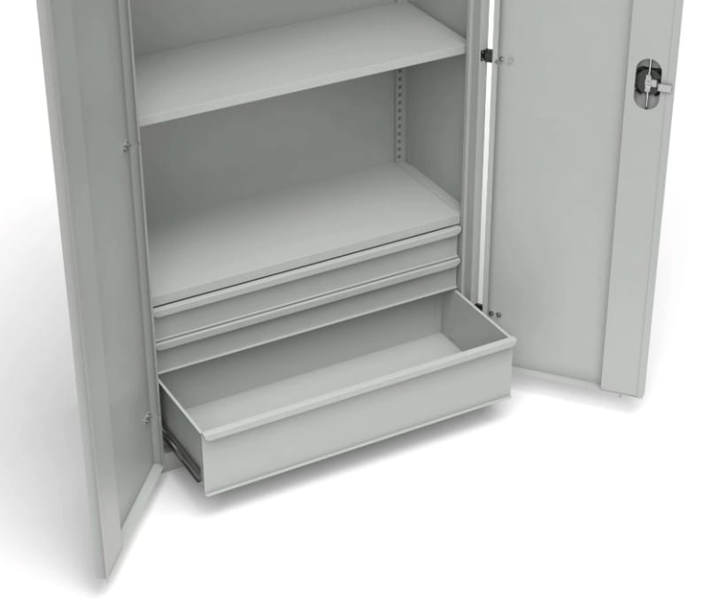 - drzwi szafy warsztatowej osadzone na zawiasach zewnętrznych, zamykane zamkiem z pokrętłem, z 3 punktowym systemem ryglowania