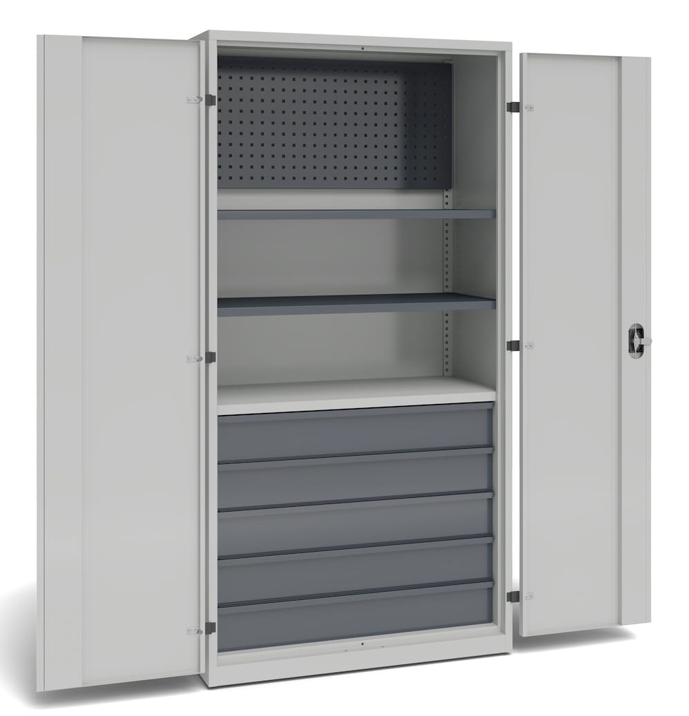 Szafa warsztatowa do przechowywania z panelem perforowanym, 2 przestawnymi półkami, 1 stałą półką, 5 szufladami o wysokości 150 mm.