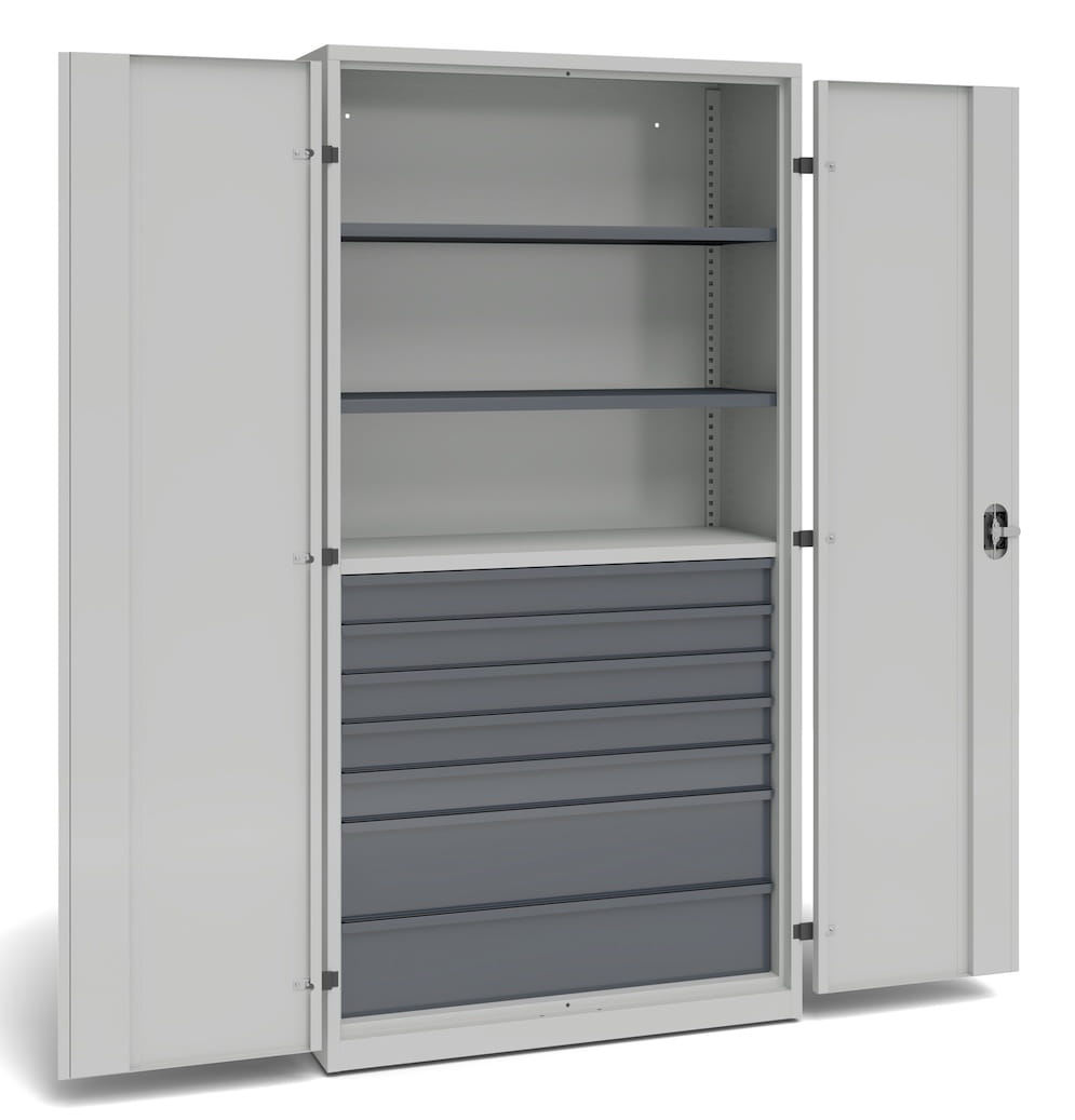 Szafa warsztatowa do przechowywania z 2 przestawnymi półkami, 1 stałą półką, 5 szufladami o wysokości 100 mm, 2 szufladami o wysokości 200 mm.