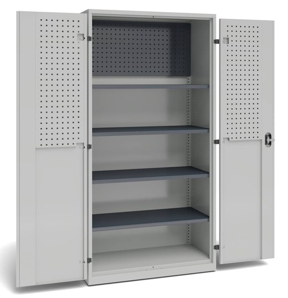 Szafa warsztatowa do przechowywania, została wyposażona w panel perforowany, 4 przestawne półki, i panele perforowane na drzwiach