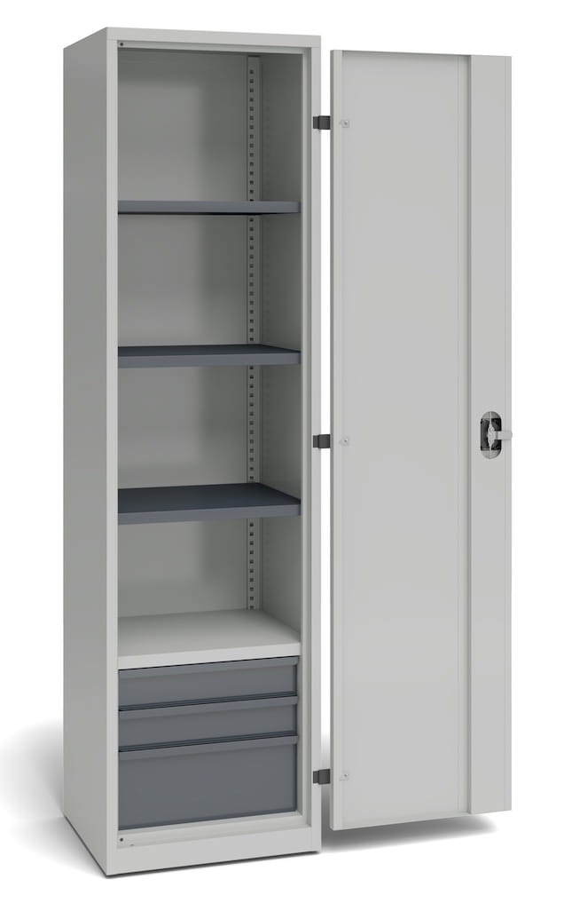 - drzwi szafy warsztatowej osadzone na zawiasach zewnętrznych, zamykane zamkiem z pokrętłem, z 3 punktowym systemem ryglowania