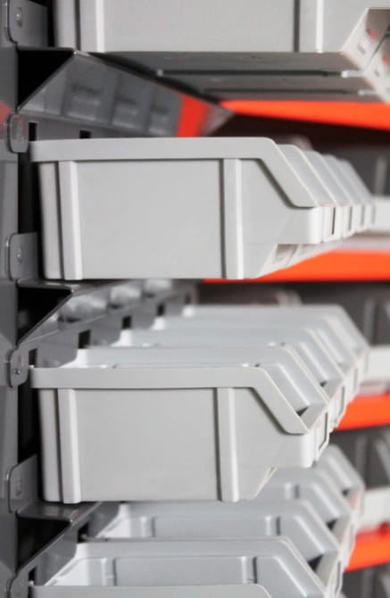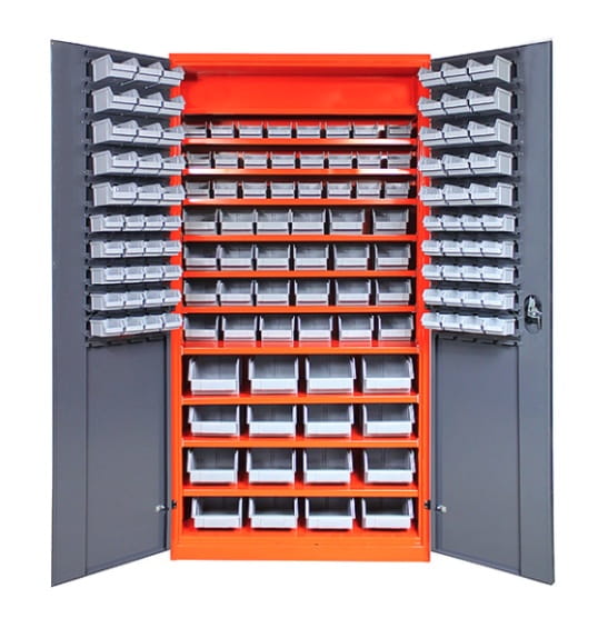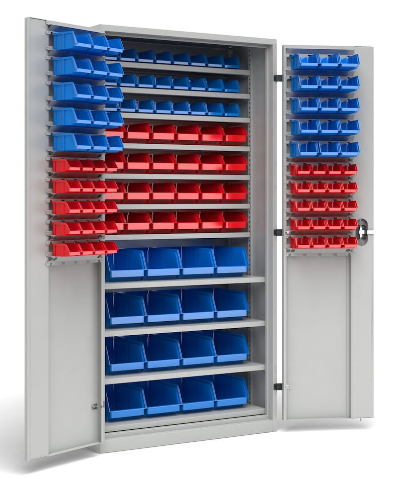 Szafa warsztatowa do przechowywania, została wyposażona w 11 przestawnych półek i 134 pojemniki z wytrzymałego polipropylenu