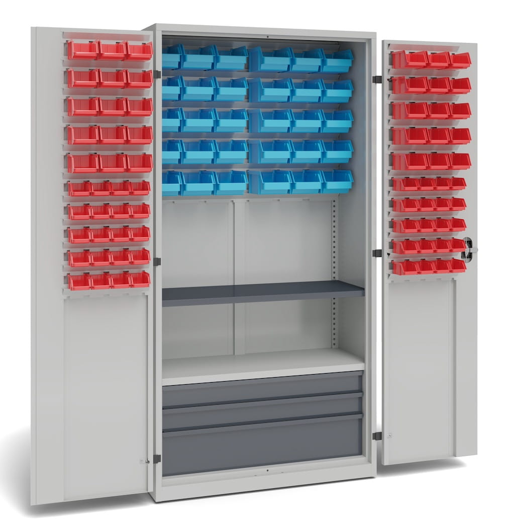 Szafa z pojemnikami do przechowywania, została wyposażona w 1 przestawną półkę, 1 stałą półkę, 2 szuflady o wysokości 100 mm, 1 szufladę o wysokości 200 mm i 100 pojemników z polipropylenu.
