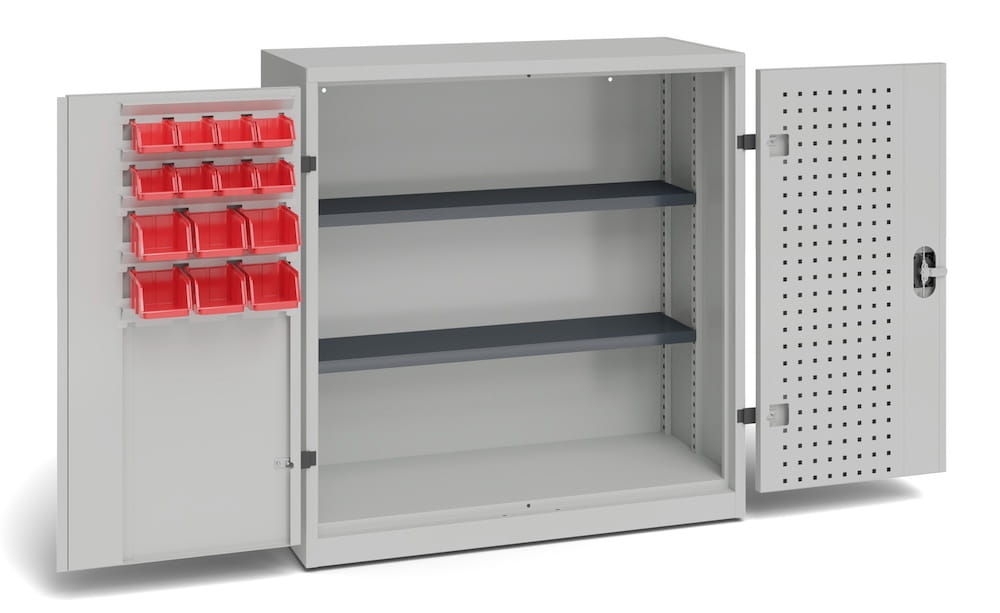 Szafka z pojemnikami do przechowywania, została wyposażona w panel perforowany, 2 przestawne półki i 1 półkę stałą i 14 pojemników polipropylenu.