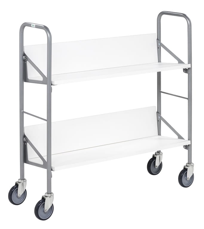 Wózek na segregatory z 2 ukośnymi półkami z białej melaminy. Rama malowana proszkowo na szaro.