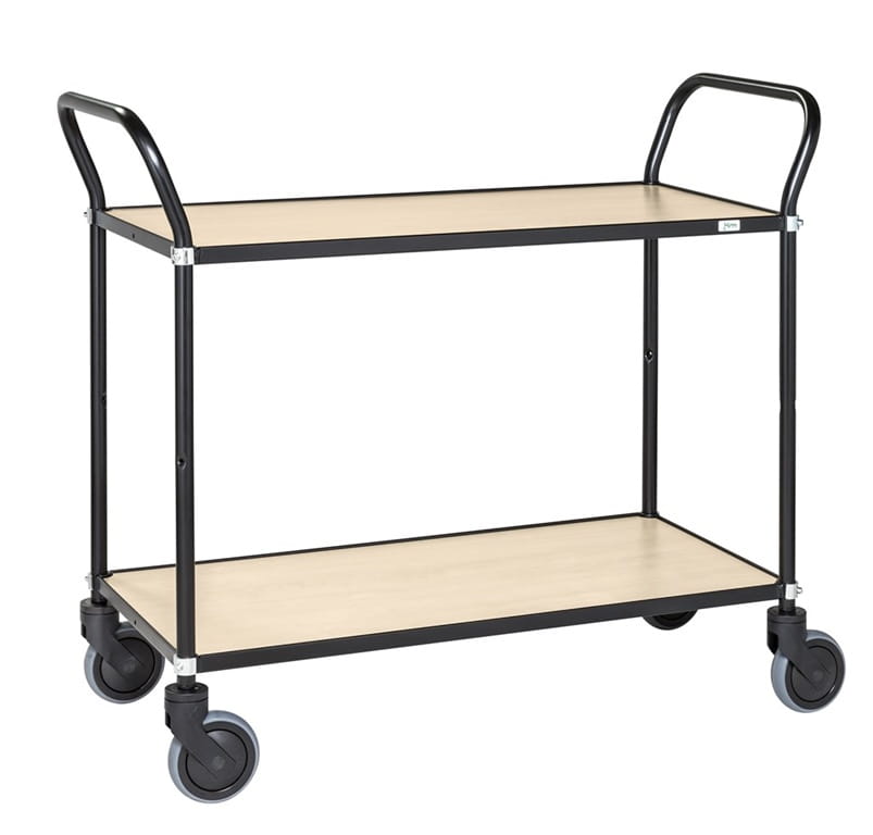 Elegancki wózek stołowy z dwiema półkami. Lakierowany proszkowo, z laminowanymi półkami.
