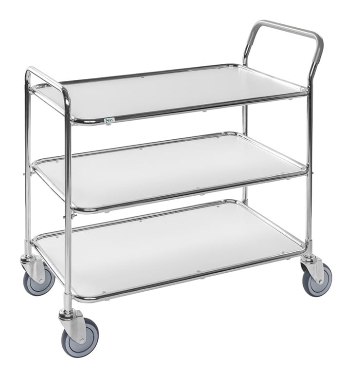 Mniejszy wózek serwisowy z 3 półkami. Uchwyt z tworzywa sztucznego zapewnia wygodny chwyt i zapobiega wychłodzeniu dłoni. Ocynkowany elektrolitycznie, z półkami laminowanymi.