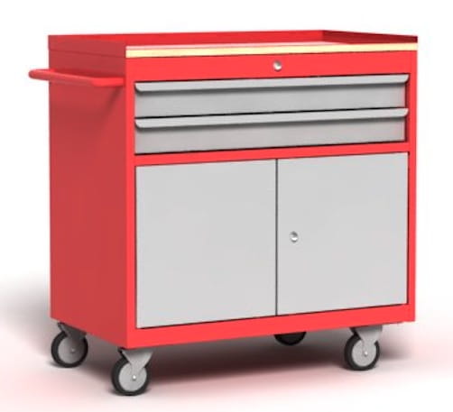 Wózek warsztatowy narzędziowy idealny do warsztatu, garażu. Wózek warsztatowy posiada dwie szuflady, dwie szafki z drzwiami skrzydłowymi, i blat ze sklejki liściastej o grubości 30 mm.