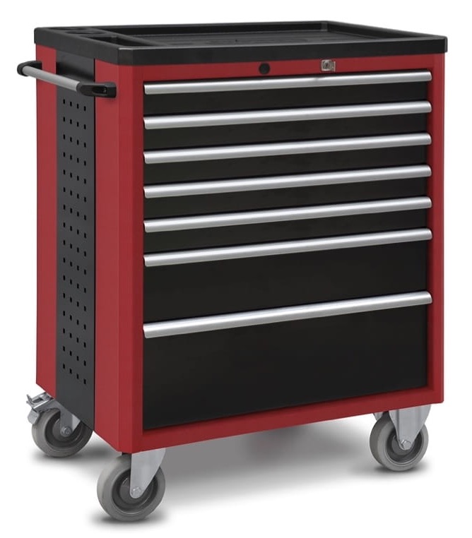 Wózek warsztatowy to praktyczny wózek narzędziowy do przechowywania różnego rodzaju narzędzi. Sprawdzi się do serwisu samochodowego, warsztatu, hali produkcyjnej. Wózek narzędziowy został wyposażony w siedem szuflad zamykanych zamkiem cylindrycznym. Wózek warsztatowy posiada wygodny uchwyt który ułatwia manewrowanie wózkiem.